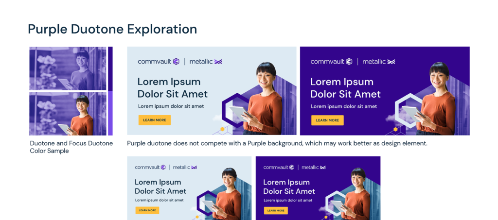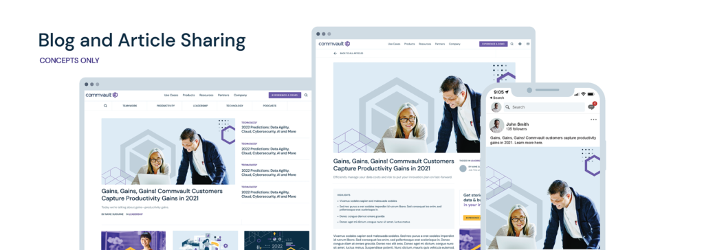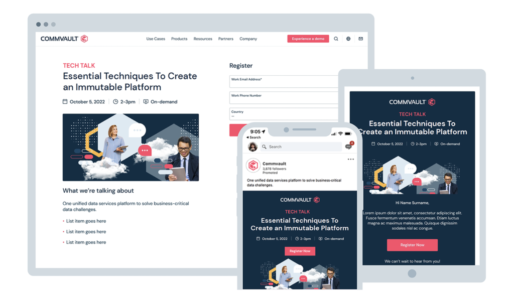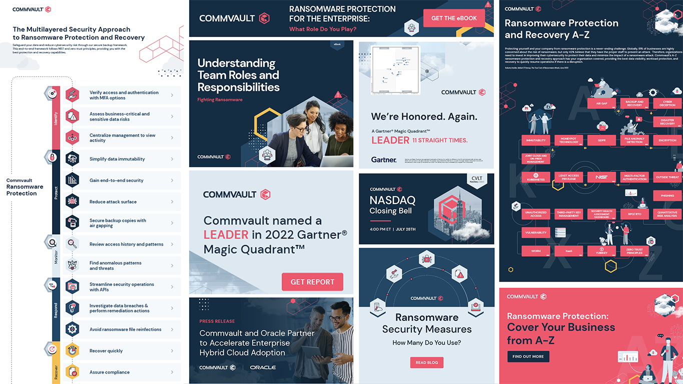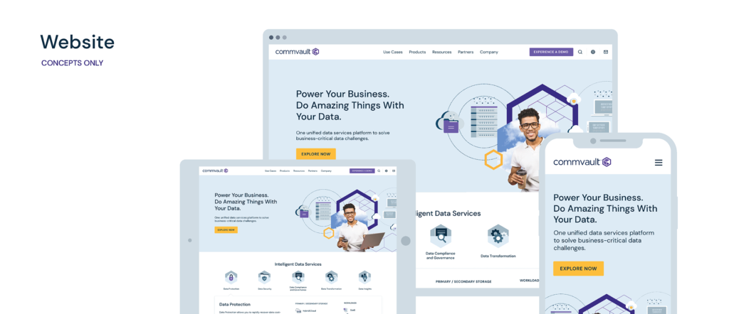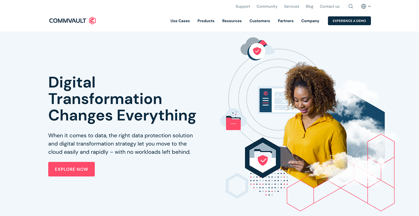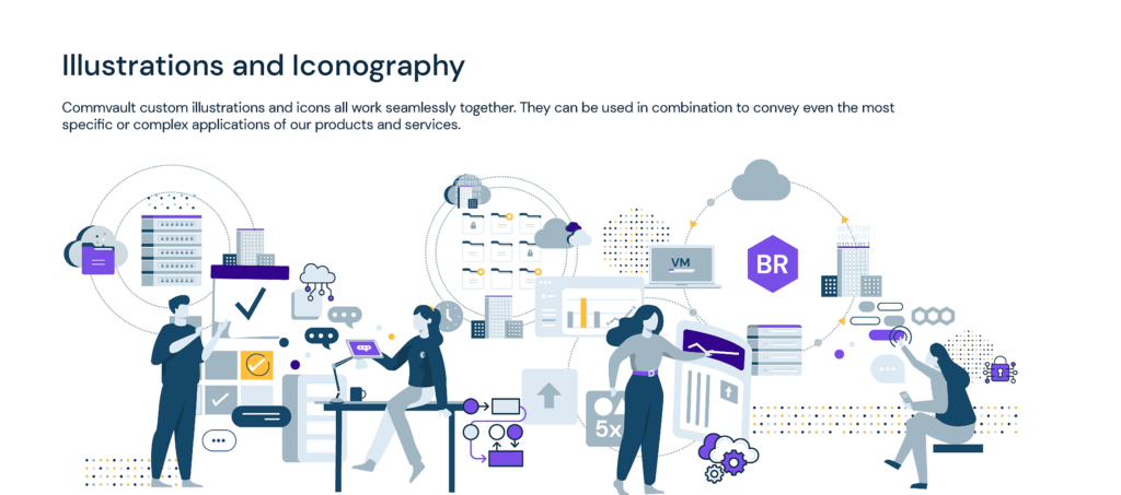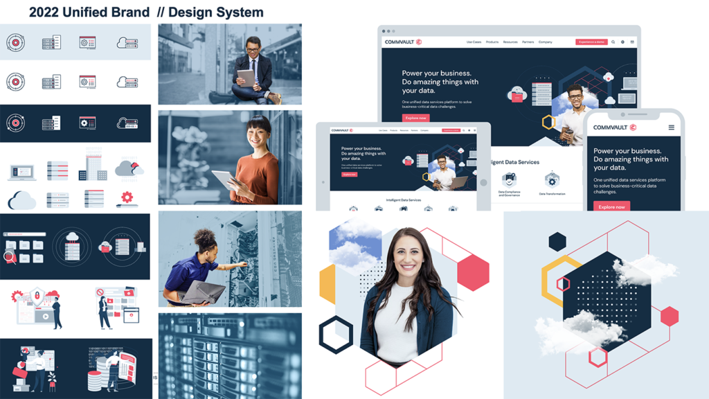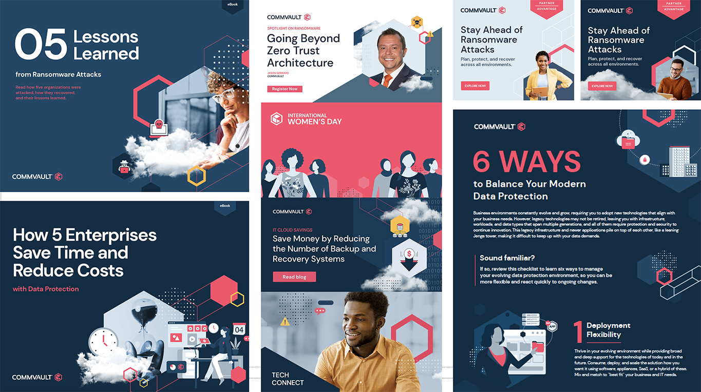 Craft a contemporary, vibrant, and dynamic visual language that elevates the distinctiveness of Commvault’s brand identity. Strive for a B2C aesthetic, emphasizing the integration of people-centric photography to amplify social media engagement. Leveraging existing visual components, place a particular emphasis on showcasing the company’s unwavering dedication to cloud transformation. Furthermore, establish clear differentiation from key competitors including Cohesity, Rubrik, and Veeam.