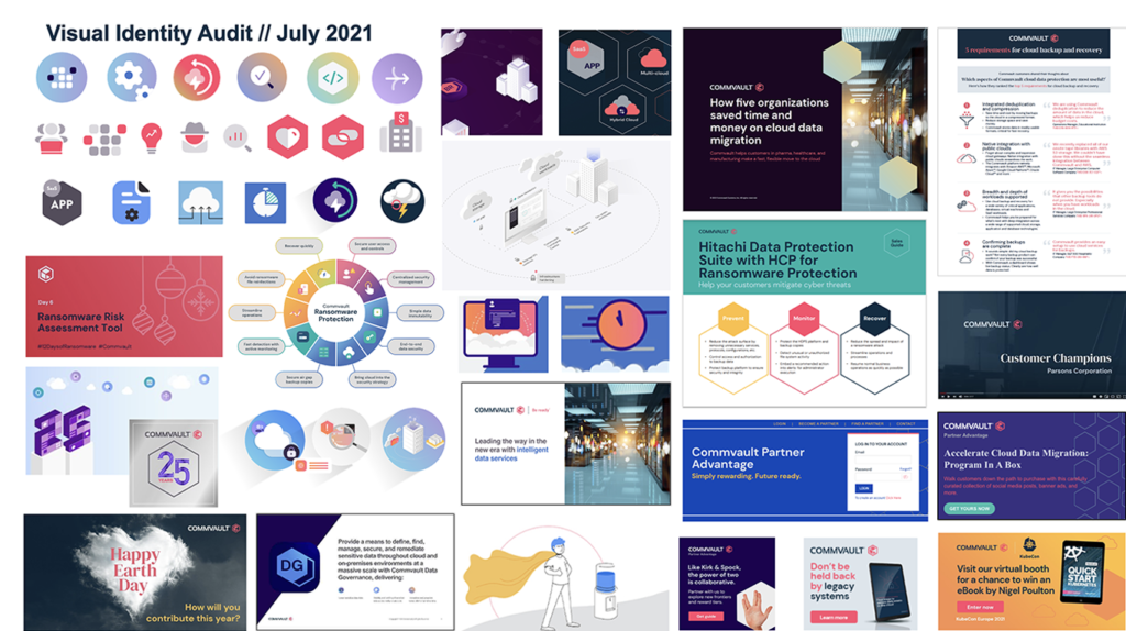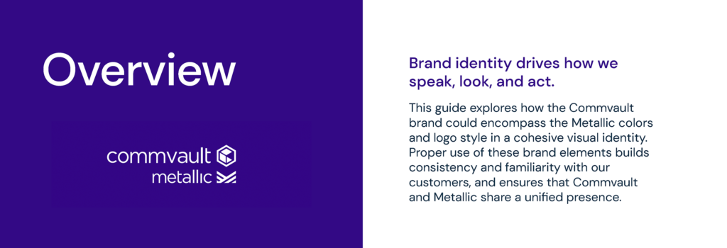 Conduct a comprehensive visual language audit and evaluation of COMMVAULT’s parent brand, spanning seven years of multiple rebrands. Propose a pragmatic brand refresh aimed at minimal disruption and cost, while ensuring the retention of the METALLIC product as a separate, stand-alone identity. Construct a versatile identity framework capable of accommodating potential sub-brands, such as the Commvault Partner department, ensuring scalability, efficiency, and agility to support rapid deployment and adaptation.